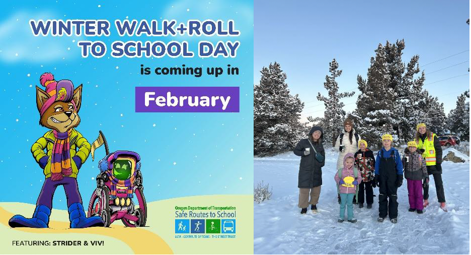 La Pine Elementary School – On February 4 and May 6, La Pine Elementary School will participate in Winter Walk & Roll Day to encourage walking, biking or otherwise rolling to and from school. Walk & Roll groups will depart at the following times, at the designated locations. You can also join along the way. Please confirm with your student(s) in advance, how they will commute home after school.